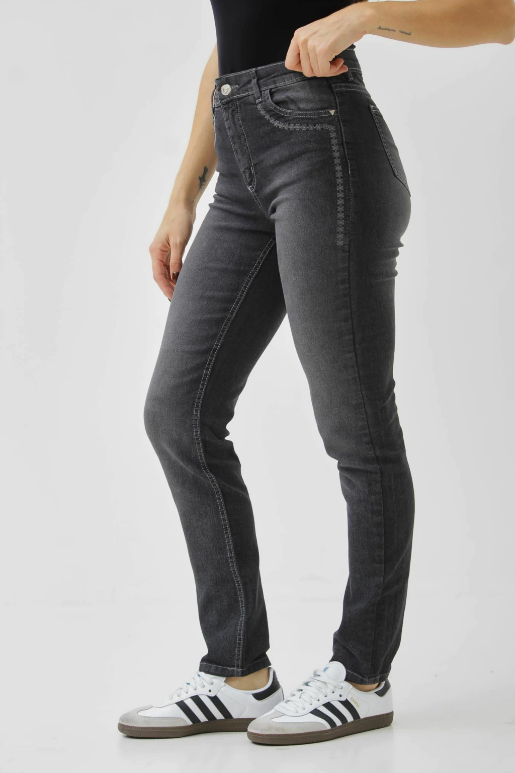 Este pantalón slim elastizado en denim negro desgastado combina calce ajustado con comodidad. Tiene bordado decorativo en los bolsillos delanteros y laterales, que le da un detalle distintivo sin perder su estilo minimalista. Tiro alto y cintura con botón metálico. Ideal para todos los días.